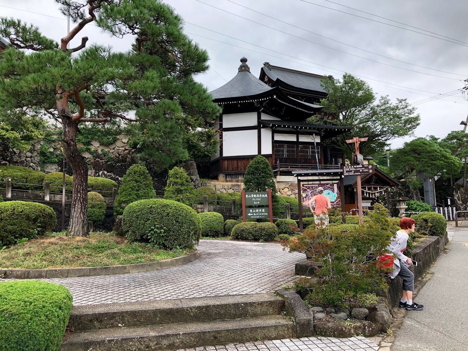 It rained most of our last morning but that didn't stop the two of us from walking part of the path at the end of the old town, one that skirts a cemetery and winds through temples and shrines with a steep path up to ruins of Takayama's former castle. We'd planned to make the 3.5 kilometer walk but with the rain stopped short of going up to the castle ruins high above us. The first photo was taken when we first arrived and walked the length of the old town to find this shrine at the end. The red head in the foreground is our companion who didn't walk back with us in the rain.